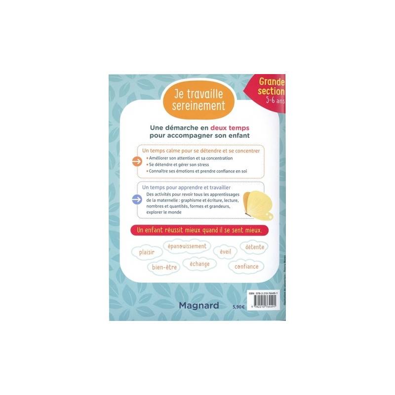 Parce qu'un enfant réussit mieux quand il se sent bien : une collection qui place le bien-être au cœur des apprentissages. Chaque cahier regroupe des activités autour de l'attention et de la concentration, comme mise en condition à des activités dans les disciplines scolaires. ? Des activités ludiques et variées pour aider l'enfant à se détendre, à se concentrer et à s'épanouir : activités d'observation, gestion des émotions, exercices de respiration, confiance en soi, yoga, étirement, gestion du stress, travail sur les 5 sens, dessin, calligraphie...