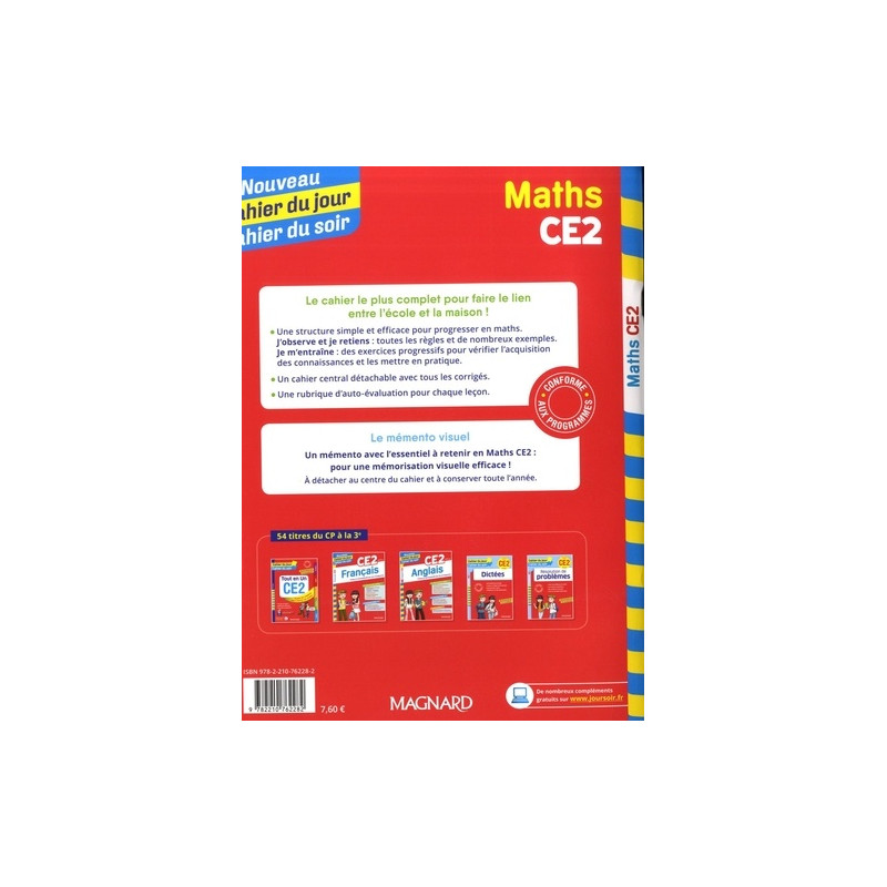 Le cahier le plus complet pour faire le lien entre l'école et la maison ! Une structure simple et efficace pour progresser en maths. J'observe et je retiens : toutes les règles et de nombreux exemples. Je m'entraîne : des exercices progressifs pour vérifier l'acquisition des connaissances et les mettre en pratique. Un cahier central détachable avec tous les corrigés. Une rubrique d'auto-évaluation pour chaque leçon.