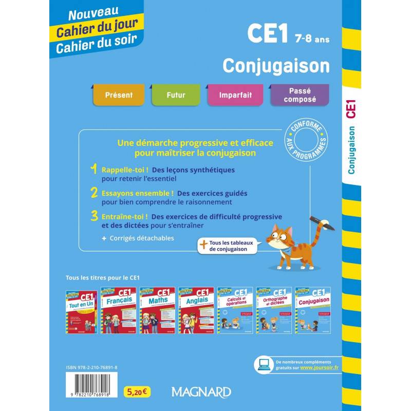 Ce cahier propose un entraînement systématique pour maîtriser tous les temps au programme du CE1 : présent, imparfait et futur. Une démarche progressive et efficace pour revoir les notions essentielles et consolider les bases : Toutes les règles : des leçons synthétiques pour retenir l'essentiel ; Un exercice d'application "pas à pas" avec des aides et des étapes ; Des exercices de difficulté progressive avec des astuces ; Une dictée finale pour utiliser les temps étudiés + Tous les tableaux de conjugaison + Des corrigés détachables.