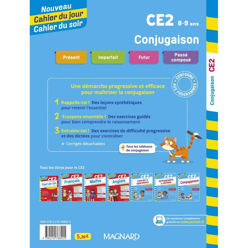 Un cahier conçu et recommandé par les enseignants pour permettre à l'enfant de maîtriser tous les temps au programme du CE2 : présent, imparfait, futur et passé composé. Une démarche pas à pas pour tout comprendre : Des leçons synthétiques avec toutes les règles ; Un exercice guidé pour consolider ses acquis ; Des exercices progressifs pour s'entraîner ; Une dictée finale + Les tableaux de conjugaison avec tous les verbes et tous les temps à connaître + Des corrigés détachables au centre de l'ouvrage.