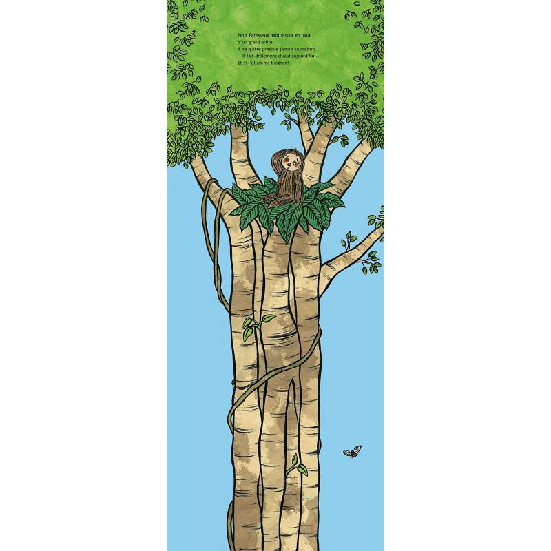 Quelle canicule aujourd'hui, comment se rafraîchir ? Petit Paresseux a une bonne idée : aller se baigner ! Tout au long de sa descente, pas à pas, il rencontre ses amis et tous veulent l'accompagner. En voulant attraper un fruit bien mûr, patatras, il lâche sa liane et plouf ! tombe à l'eau plus vite que prévu. Tant mieux, quel délice ! C'est une journée de rêve, mais quand le soleil va se coucher, il faut remonter dans le nid, et c'est haut...