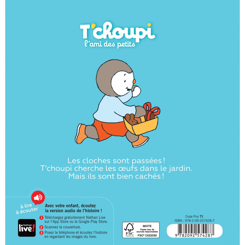 Les cloches sont passées... Vite, T'choupi court dans le jardin pour chercher les œufs de Pâques. Comme ils sont bien cachés ! Heureusement Papi et Mamie sont là pour aider T'choupi. Miam, c'est bon le chocolat !