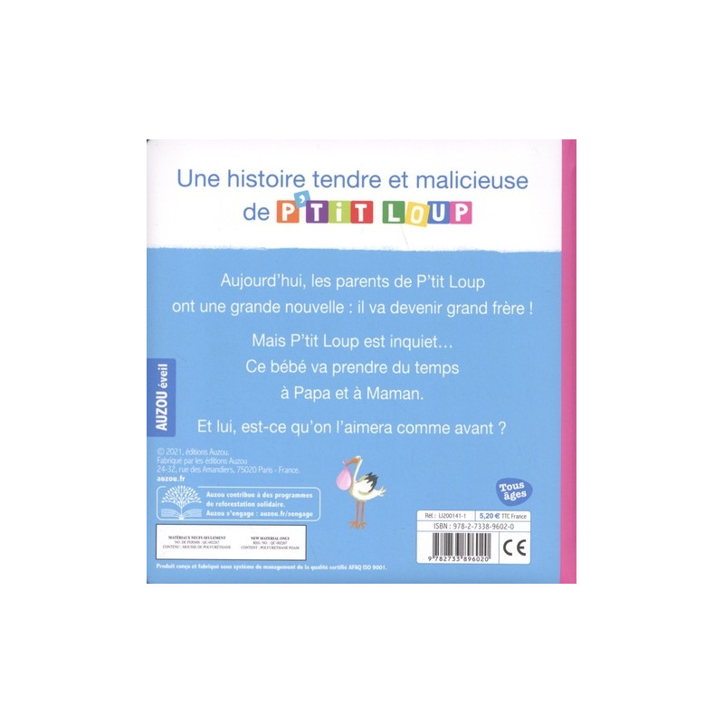 Aujourd'hui, les parents de P'tit Loup ont une grande nouvelle : il va devenir grand frère ! Mais P'tit Loup est inquiet... Ce bébé va prendre du temps à Papa et à Maman. Et lui, est-ce qu'on l'aimera comme avant ?