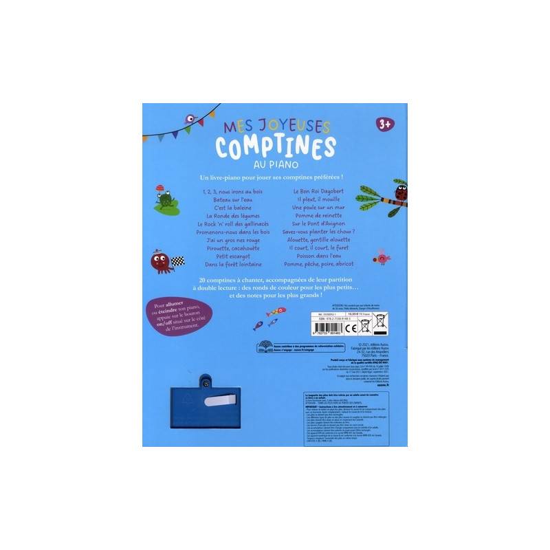 Un livre-piano pour jouer ses comptines préférées ! 20 comptines à chanter accompagnées d'une partition à double lecture : des ronds de couleurs pour les plus petits... et des notes pour les plus grands ! Liste des comptines : - 1, 2, 3 nous irons au bois ; - Bateau sur l'eau ; - C'est la baleine ; - La Ronde des légumes ; - Le Rock 'n' roll des gallinacés ; - Promenons-nous dans les bois ; - J'ai un gros nez rouge ; - Pirouette, cacahouète ; - Petit escargot ; - Pans la forêt lointaine ; - Le Bon Roi Dagobert ; - Il pleut, il mouille ; - Une poule sur un mur ; - Pomme de reinette ; - Sur le Pont d'Avignon ; - Savez-vous planter les choux ? - Alouette, gentille alouette ; - Il court, il court, le furet ; - Poisson dans l'eau ; - Pomme, pêche, poire, abricot.
