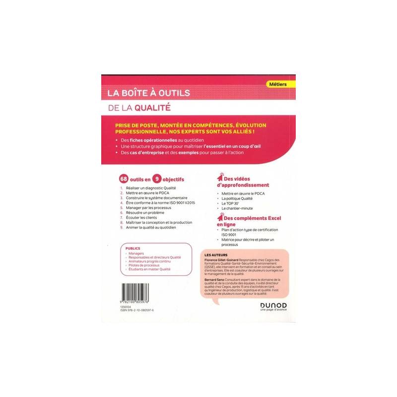La Boîte à outils de la qualité propose 68 outils essentiels et immédiatement opérationnels à toutes les étapes d'une démarche qualité : - pour engager un processus de certification ISO 9001 ou une démarche centrée client ; - pour déployer un management par les processus ; - pour dynamiser un système qualité déjà en place ; - pour assurer la conformité des produits et prestations. Dans cette 4e édition mise à jour, les outils sont regroupés par thématiques, présentés de manière visuelle sur deux ou quatre pages : une représentation graphique, l'essentiel, Pourquoi et Comment l'utiliser, les avantages et les précautions à prendre, et des approfondissements et cas pratiques.
