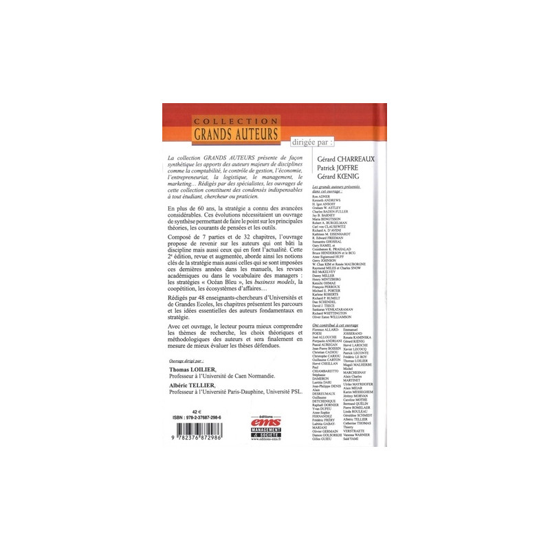 Rédigés par 48 enseignants-chercheurs d'Universités et de Grandes Ecoles, les chapitres présentent les parcours et les idées essentielles des auteurs fondamentaux en stratégie. Avec cet ouvrage, le lecteur pourra mieux comprendre les thèmes de recherche, les choix théoriques et méthodologiques des auteurs et sera finalement en mesure de mieux évaluer les thèses défendues.