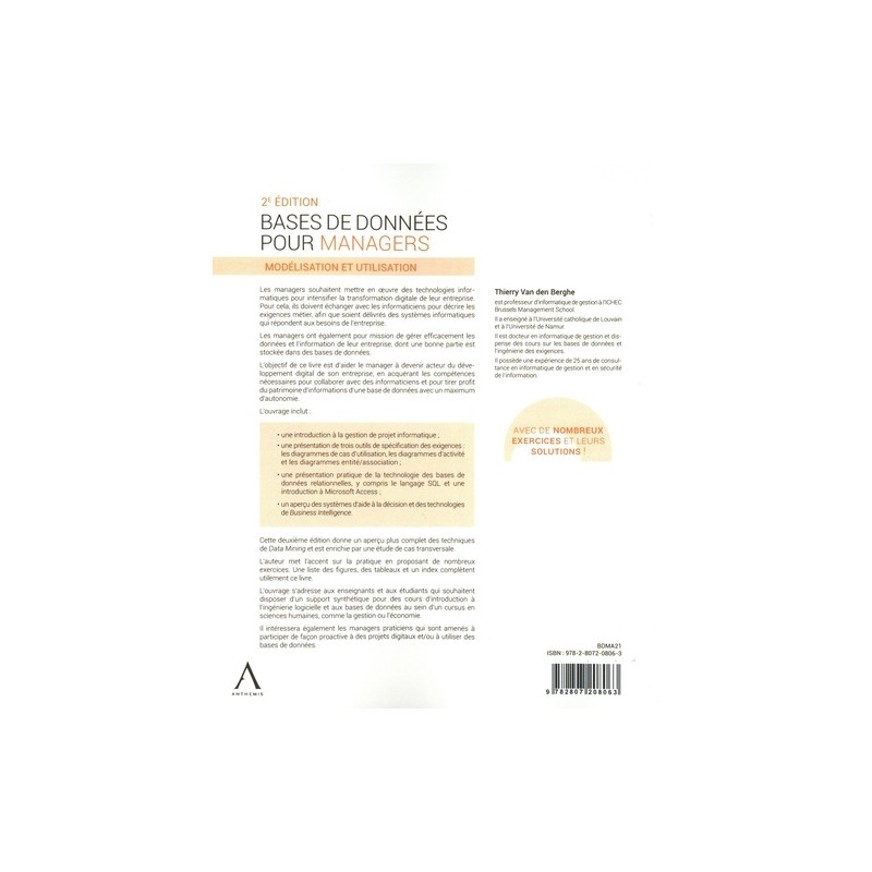 L'objectif de ce livre est d'aider le manager à devenir acteur du développement digital de son entreprise, en acquérant les compétences nécessaires pour collaborer avec des informaticiens et pour tirer profit du patrimoine d'informations d'une base de données avec un maximum d'autonomie. L'ouvrage inclut : une introduction à la gestion de projet informatique ; une présentation de trois outils de spécification des exigences : les diagrammes de cas d'utilisation, les diagrammes d'activité et les diagrammes entité/association ; une présentation pratique de la technologie des bases de données relationnelles, y compris le langage SQL et une introduction à Microsoft Access ; un aperçu des systèmes d'aide à la décision et des technologies de Business Intelligence.
