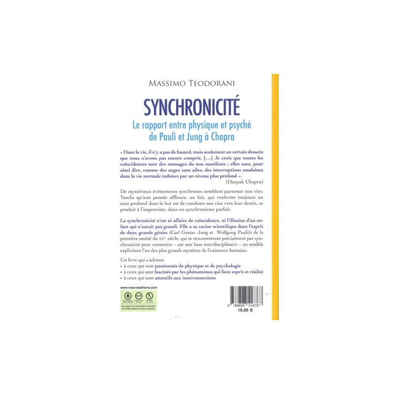 De mystérieux événements synchrones semblent parsemer nos vies. Tandis qu'une pensée affleure, un fait, qui renferme toujours un sens profond dont le but est de conduire nos vies vers leur destin, se produit à l'improviste, dans un synchronisme parfait. L'objectif de ce livre est de démontrer le phénomène de la "synchronicité" . Ces recherches plongent leurs racines dans l'alliance harmonieuse entre le grand psychologue analytique Carl Gustav Jung et le physicien quantique Wolfgang Pauli.