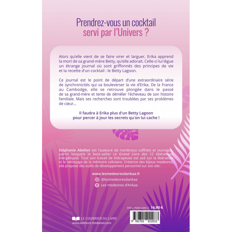 Le premier roman feel good de Stéphanie Abellan. Un cocktail parfait entre ésotérisme, développement personnel et romance ! Alors qu'elle vient de se faire larguer, Erika apprend la mort de sa grand-mère Betty, qu'elle adorait. Celle-ci lui lègue un mystérieux carnet où sont griffonnés des principes de vie, des anecdotes personnelles et une recette de cocktail : le Betty Lagoon. Ce carnet est le point de départ d'une extraordinaire série de synchronicités et de bouleversements.