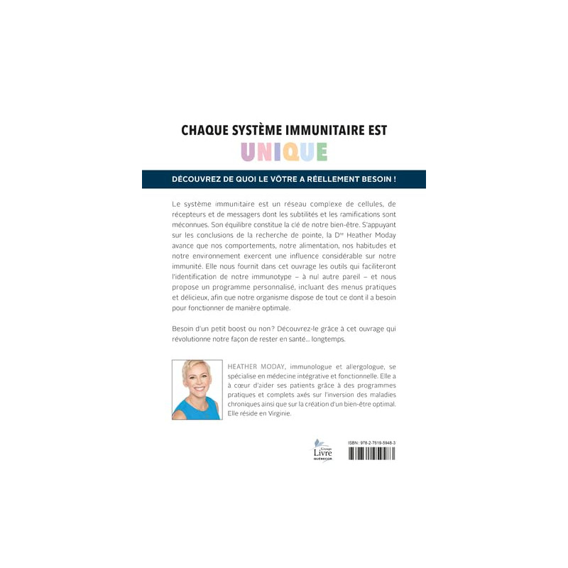 On parle souvent de le " booster " ou de le " renforcer ", mais qu'est-ce que cela signifie exactement et est-ce requis pour tout le monde ? Dans "A chacun son système immunitaire", la Dre Heather Moday répond clairement à ces questions et montre que l'équilibre du système immunitaire est effectivement la clé de notre bien-être et de notre santé. S'appuyant sur les conclusions de la recherche de pointe et sur des études de cas, elle affirme que notre immunité est considérablement influencée par nos comportements, notre alimentation, nos habitudes et notre environnement.