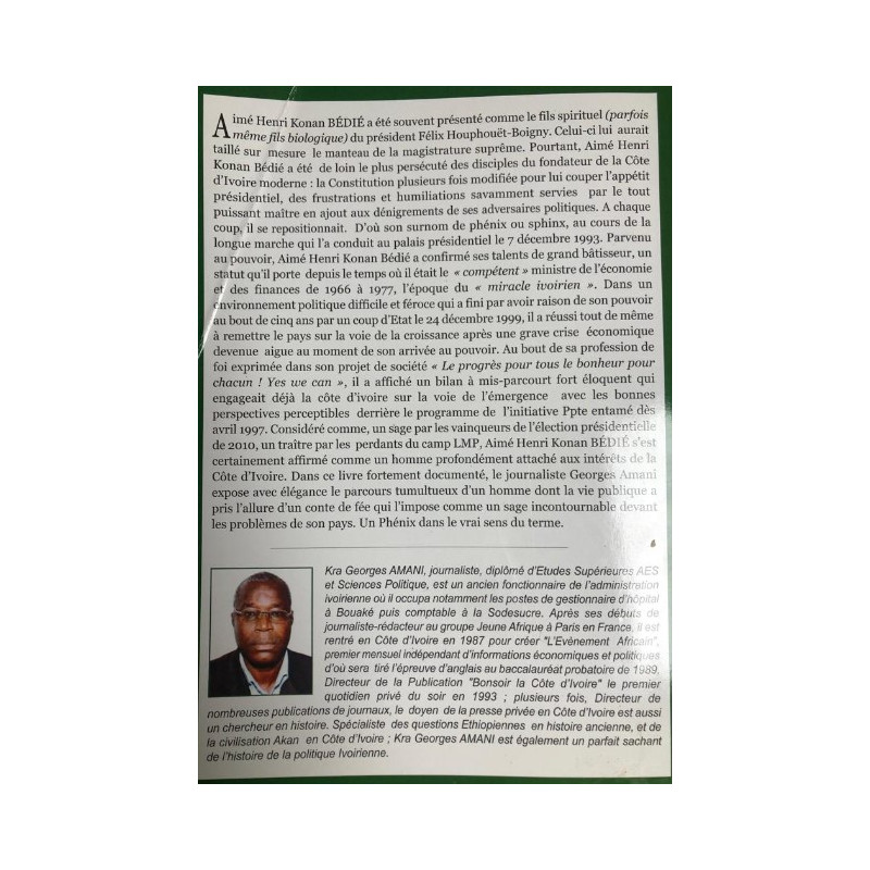 Aimé Henri Konan BÉDIÉ a été souvent présenté comme le fils spirituel (parfois même fils biologique) du président Félix Houphouët-Boigny. Celui-ci lui aurait taillé sur mesure le manteau de la magistrature suprême. Pourtant, Aimé Henri Konan Bédić a été de loin le plus persécuté des disciples du fondateur de la Côte d'lvoire moderne: la Constitution plusieurs fois modifiée pour lui couper l'appétit présidentiel, des frustrations et humiliations savamment servies par le tout Puissant maître en ajout aux dénigrements de ses adversaires politiques. A chaque coup, il se repositionnait. D'où son surnom de phénix ou sphinx, au cours de la longue marche qui l'a conduit au palais présidentiel le 7 décembre 1993- Parvenu au pouvoir, Aimé Henri Konan Bédié a confirmé ses talents de grand bâtisseur, un statut qu'il porte depuis le temps où il était le < compétent» ministre de l'économie et des finances de 1966 à 1977, l'époque du « miracle ivoirien ». Dans un environnement politique difficile et féroce qui a fini par avoir raison de son pouvoir au bout de cinq ans par un coup d'Etat le 24 décembre 1999, il a réussi tout de même à remettre le pays sur la voie de la croissance après une grave crise économique devenue aigue au moment de son arrivée au pouvoir. Au bout de sa profession de foi exprimée dans son projet de société « Le progrès pour tous le bonheur pour chacun ! Yes we can », il a affiché un bilan à mis-parcourt fort éloquent qui engageait déjà la côte d'ivoire sur la voie de l'émergence avec les bonnes perspectives perceptibles derrière le programme de l'initiative Ppte entamé dès avril 1997. Considéré comme, un sage par les vainqueurs de l'élection présidentielle de 2010, un traître par les perdants du camp LMP, Aimé Henri Konan BÉDIÉ s'est certainement affirmé comme un homme profondément attaché aux intérêts de la Côte d'Ivoire. Dans ce livre fortement documenté, le journaliste Georges Amani expose avec élégance le parcours tumultueux d'un homme dont la vie publique a pris 'allure d'un conte de fée qui l'impose comme un sage incontournable devant les problèmes de son pays. Un Phénix dans le vrai sens du terme.