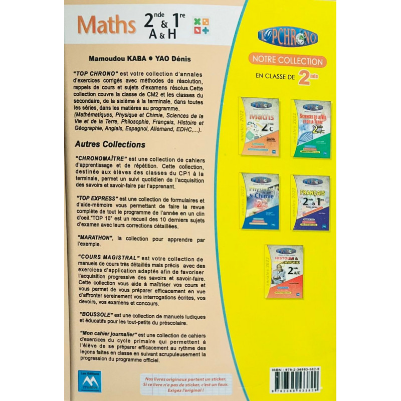 Le “TOPCHRONO” est votre collection d’annales d’exercices corrigés avec méthodes de résolution, rappels de cours et sujets d’examens et sujets d’examens résolus. Cette collection couvre la classe de CM2 et les classes du secondaire, de la sixième à la terminale, dans toutes les séries, dans les matières au programme (Mathématique, Physique et Chimie, Science de la vie et de la terre, Philosophie, Français, Histoire-Géo, Anglais, Espagnol, Allemand, EDHC,…)