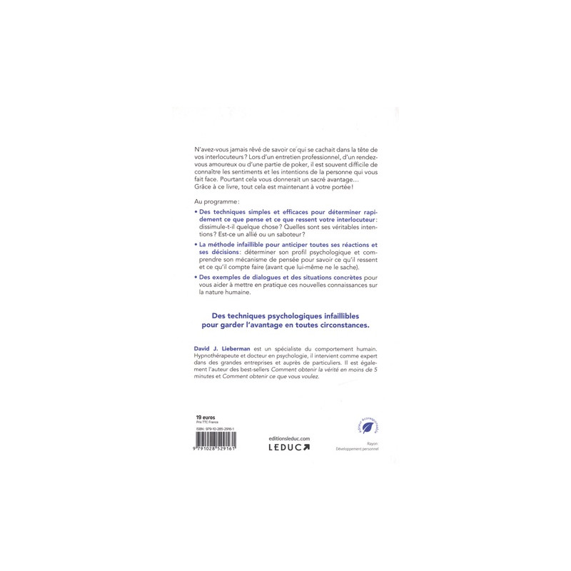 N'avez-vous jamais rêvé de savoir ce qui se cachait dans la tête de vos interlocuteurs ? Lors d'un entretien professionnel, d'un rendezvous amoureux ou d'une partie de poker, il est souvent difficile de connaître les sentiments et les intentions de la personne qui vous fait face. Pourtant cela vous donnerait un sacré avantage... Grâce à ce livre, tout cela est maintenant à votre portée ! Au programme : Des techniques simples et efficaces pour déterminer rapidement ce que pense et ce que ressent votre interlocuteur : dissimule-t-il quelque chose ? Quelles sont ses véritables intentions ? Est-ce un allié ou un saboteur ? La méthode infaillible pour anticiper toutes ses réactions et ses décisions : déterminer son profil psychologique et comprendre son mécanisme de pensée pour savoir ce qu'il ressent et ce qu'il compte faire (avant que lui-même ne le sache). Des exemples de dialogues et des situations concrètes pour vous aider à mettre en pratique ces nouvelles connaissances sur la nature humaine. Des techniques psychologiques infaillibles pour garder l'avantage en toutes circonstances.