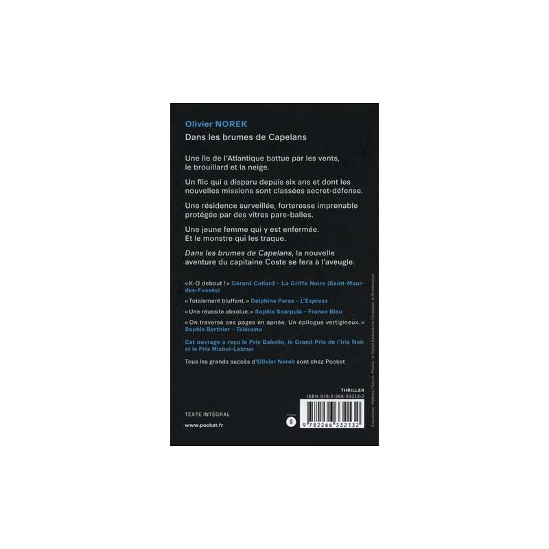 Le grand retour du capitaine Coste. Une île de l'Atlantique battue par les vents, le brouillard et la neige. Un flic qui a disparu depuis six ans et dont les nouvelles missions sont classées secret défense. Sa résidence surveillée, forteresse imprenable protégée par des vitres pare-balles. Une jeune femme qu'il y garde enfermée. Et le monstre qui les traque. Dans les brumes de Capelans, la nouvelle aventure du capitaine Coste se fera à l'aveugle.