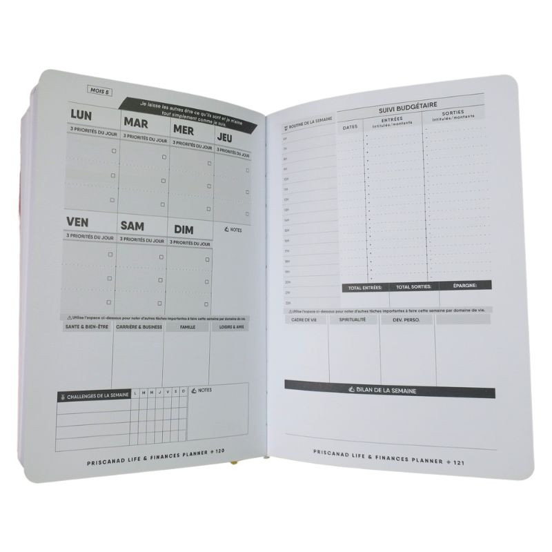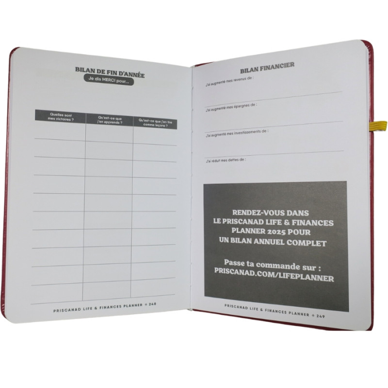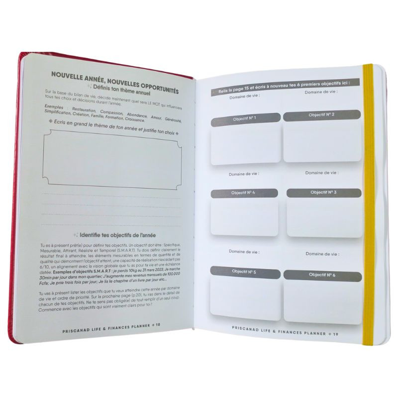 Ton guide de planification annuelle pour atteindre facilement tous tes objectifs. Si tu fais partie des 95% de personnes qui n’atteignent jamais leurs objectifs à la fin de l’année, si le manque de discipline, la procrastination, la paresse continue de t’éloigner encore de la vie que tu veux et t’empêche de devenir ce que tu souhaites au fond de toi, le Priscanad Life & Finances Planner est pour toi !. Le Priscanad Life and Finances Planner est un planificateur annuel daté qui combine réflexion, visualisation et planification pour te permettre de déterminer, préciser et atteindre tes objectifs personnels et/ou professionnels. C’est un coach personnel qui t’aide à atteindre facilement et rapidement tes objectifs sans finir frustré à la fin de l'année. Il te guide étape par étape chaque mois, chaque semaine et chaque jour en t’aidant à rester concentré sur ce qui est le plus important pour toi. Il y a une place pour chaque idée, pensée et intention afin de rester organisé(e) tout le long de l’année.