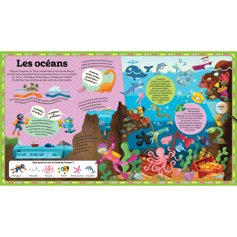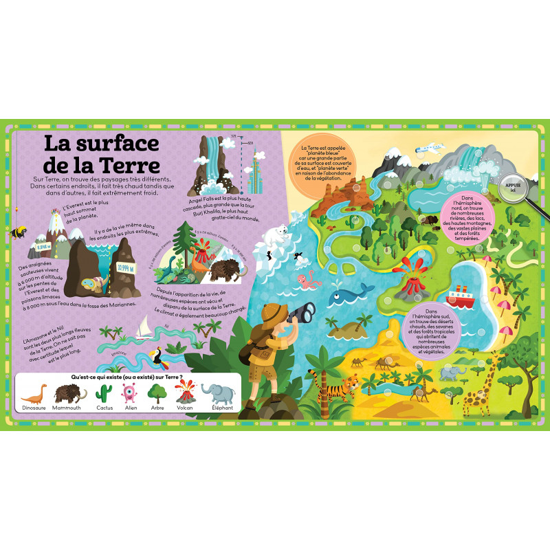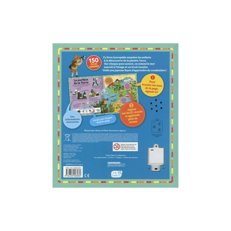 Ce livre incroyable emmène les enfants à la découverte de la planète Terre. Sur chaque puce sonore, on entend le mot associé à l'image et un bruit…
