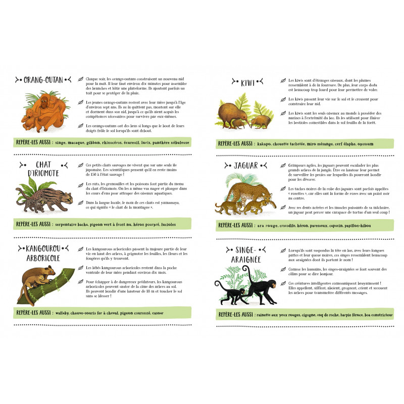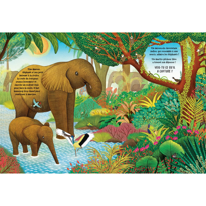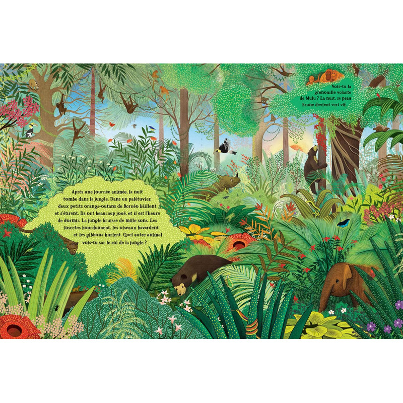 "La nuit tombe après une journée bien remplie dans la jungle et deux jeunes orangs-outans s'apprêtent à se coucher. Autour d'eux, les pandas, les kiwis et les lémuriens aussi sont fatigués... Arriveras-tu à tous les trouver ? Avec de nombreuses infos sur les animaux des jungles du monde entier, ce cherche-et-trouve merveilleusement illustré est parfait pour tous les petits amoureux de la nature".