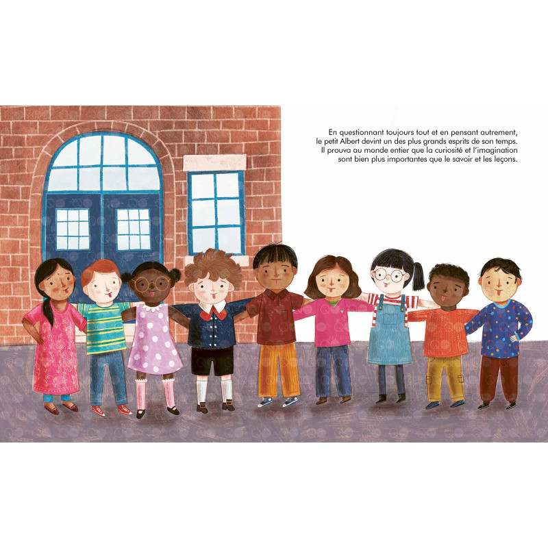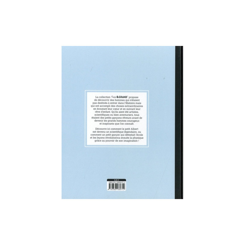 La collection Petit & grand propose de découvrir des hommes qui pétaient pas destinés à entrer dans l'Histoire mais qui ont accompli des choses extraordinaires en écoutant leur cœur et en suivant leur rêve d'enfant. Qu'ils aient été artistes, scientifiques ou bien aventuriers, tous étaient des petits garçons rêveurs avant de devenir les grands hommes courageux et inspirants que l'on connaît. Découvre ici comment le petit Albert est devenu un scientifique légendaire, ou comment un petit garçon qui détestait l'école et les leçons révolutionna ensuite la physique grâce au pouvoir de son imagination !