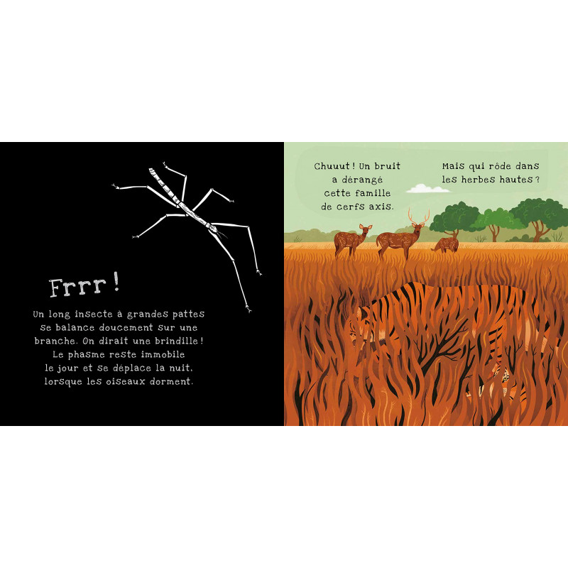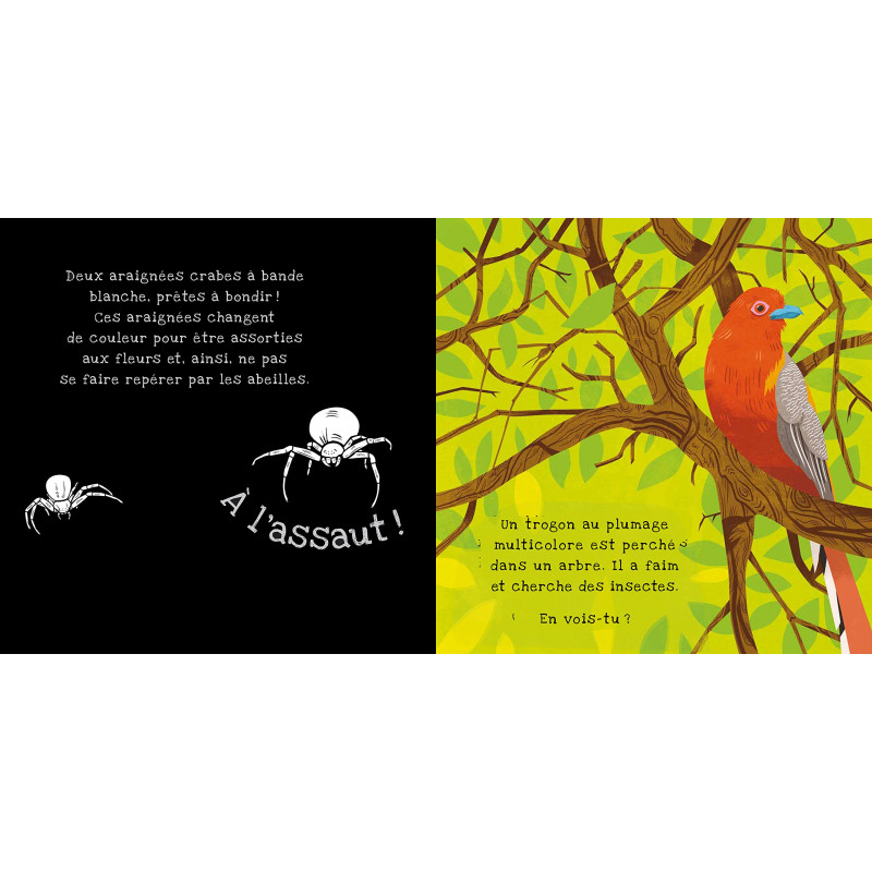 "Qui se cache dans la nature ? Si tu regardes attentivement parmi les fleurs et les arbres, sur le fond marin et dans les prés, tu pourras peut-être apercevoir des animaux bien camouflés... Allume une torche ou la lampe d'un smartphone sous la page, ou bien tiens ton livre à la lumière : les animaux cachés apparaissent ! C'est magique ! Découvre un monde rempli de surprises ! "