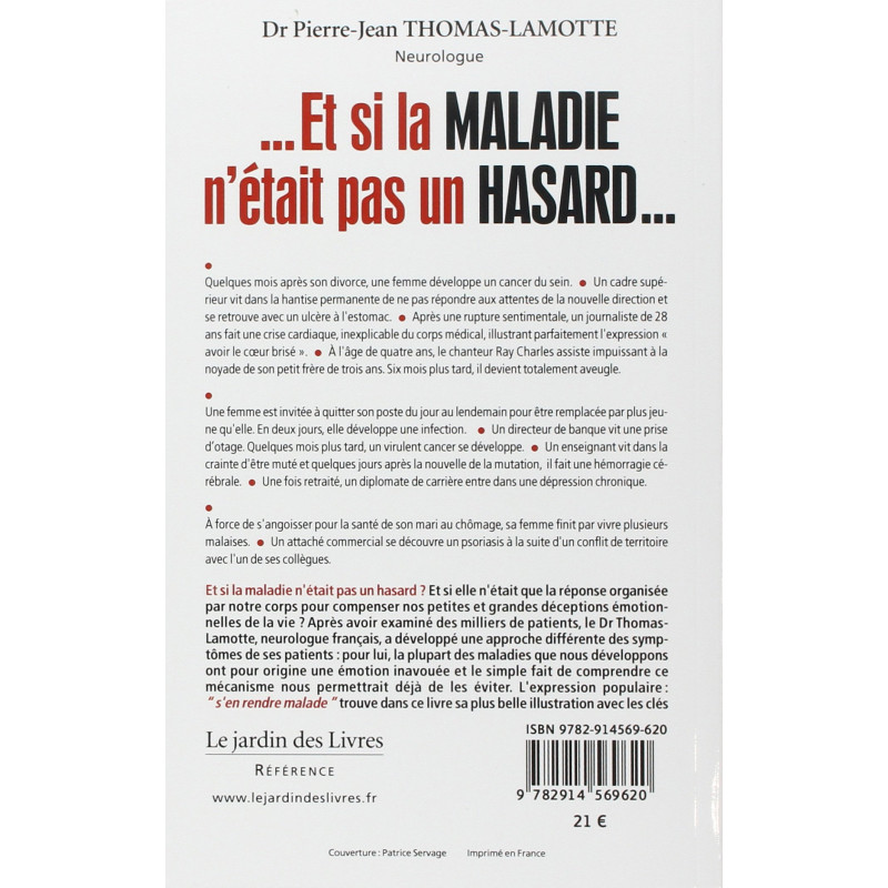 Et si la maladie n'était pas un hasard ? Et si elle n'était que la réponse organisée par notre corps pour compenser nos petites et grandes déceptions émotionnelles de la vie ? Après avoir examiné des milliers de patients, le Dr Thomas Lamotte, neurologue français, a développé une approche différente des symptômes de ses patients : pour lui, la plupart des maladies que nous développons ont pour origine une émotion inavouée et le simple fait de comprendre ce mécanisme nous permettrait déjà de les éviter. L'expression populaire: "s'en rendre malade" trouve dans ce livre sa plus belle illustration avec les clés pour décoder nos déceptions et comment les empêcher d'agir sur notre corps.