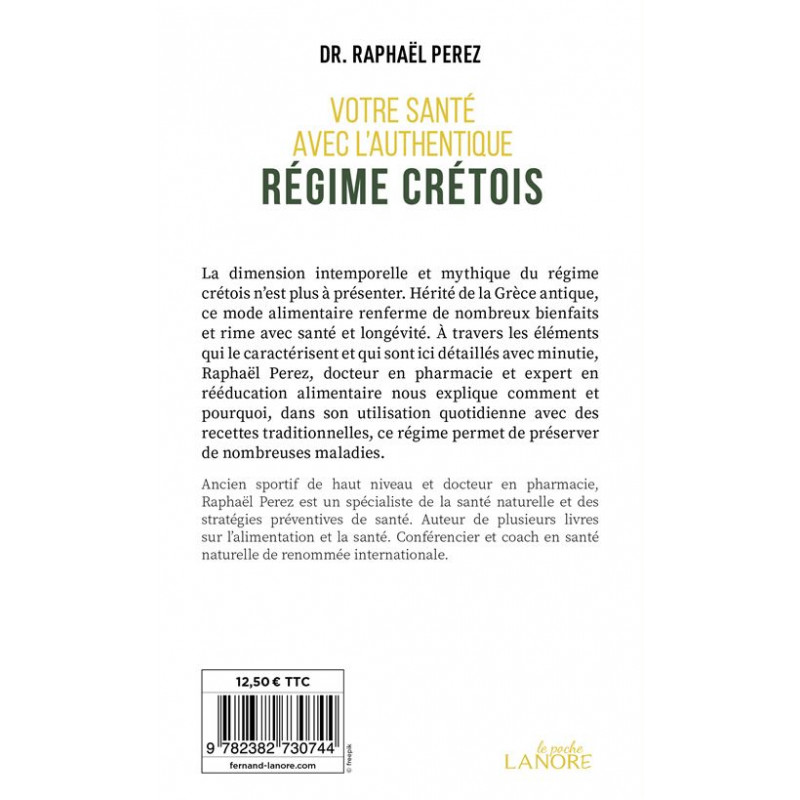 La dimension intemporelle et mythique du régime crétois n'est plus à présenter. Hérité de la Grèce antique, ce mode alimentaire renferme de nombreux bienfaits et rime avec santé et longévité. A travers les éléments qui le caractérisent et qui sont ici détaillés avec minutie, Raphaël Perez, docteur en pharmacie et expert en rééducation alimentaire nous explique comment et pourquoi, dans son utilisation quotidienne avec des recettes traditionnelles, ce régime permet de préserver de nombreuses maladies.