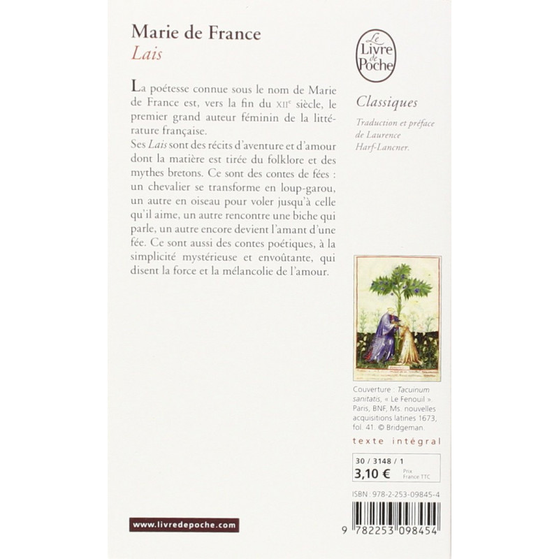 La poétesse connue sous le nom de Marie de France est, vers la fin du XIIème siècle, le premier grand auteur féminin de la littérature française. Ses Lais sont des récits d'aventure et d'amour dont la matière est tirée du folklore et des mythes bretons. Ce sont des contes de fées: un chevalier se transforme en loup-garou, un autre en oiseau pour voler jusqu'à celle qu'il aime, un autre rencontre une biche qui parle, un autre encore devient l'amant d'une fée.