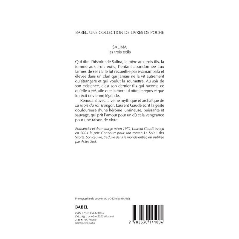 Qui dira l'histoire de Salina, la mère aux trois fils, la femme aux trois exils, l'enfant abandonnée aux larmes de sel ? Elle fut recueillie par Mamambala et élevée dans un clan qui jamais ne la vit autrement qu'étrangère et qui voulut la soumettre. Au soir de son existence, c'est son dernier fils qui raconte ce qu'elle a été, afin que la mort lui offre le repos et que le récit devienne légende. Renouant avec la veine mythique et archaïque de La Mort du roi Tsongor, Laurent Gaudé écrit la geste douloureuse d'une héroïne lumineuse, puissante et sauvage, qui prit l'amour pour un dû et la vengeance pour une raison de vivre.