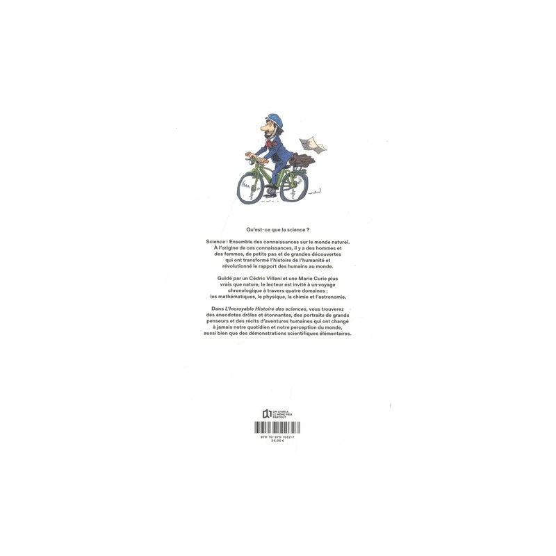 Science : Ensemble des connaissances sur le monde naturel. A l'origine de ces connaissances, il y a des hommes et des femmes, de petits pas et de grandes découvertes qui ont transformé l'histoire de l'humanité et révolutionné le rapport des humains au monde. Guidé par un Cédric Villani et une Marie Curie plus vrais que nature, le lecteur est invité à un voyage chronologique à travers quatre domaines : les mathématiques, la physique, la chimie et l'astronomie. Dans L'Incroyable Histoire des sciences, vous trouverez des anecdotes drôles et étonnantes, des portraits de grands penseurs et des récits d'aventures humaines qui ont changé à jamais notre quotidien et notre perception du monde, aussi bien que des démonstrations scientifiques élémentaires.