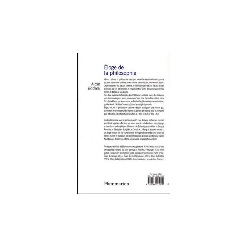 A. B. Quelle philosophie pour le siècle qui vient ? Faux dialogue platonicien, qui met en scène le "parleur" Tocéras aux prises avec des interlocuteurs issus de pays et de cultures philosophiques différents - le Britannique John After, la Grecque Amantha, le Sénégalais B'adj Akil, le Chinois Xi La Pong, et d'autres encore -, cet éloge déroule les fils d'une histoire de la pensée revisitée dans un jeu de formes inventif et libérateur, à la lumière des cinq grandes questions qu'explore Alain Badiou : démocratie, liberté, universalité, langage et incarnation.