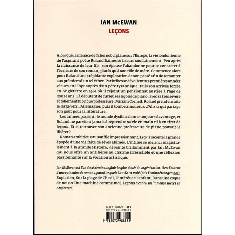 Et si retrouver son ancienne professeure de piano pouvait le libérer ? Roman ambitieux au souffle impressionnant, Leçons raconte la grande épopée d'une vie faite de rêves abîmés. L'intime se mêle ici magistralement à la grande Histoire, dépeinte brillamment par Ian McEwan qui nous offre un antihéros au charme irrésistible et une réflexion passionnante sur la vocation artistique.