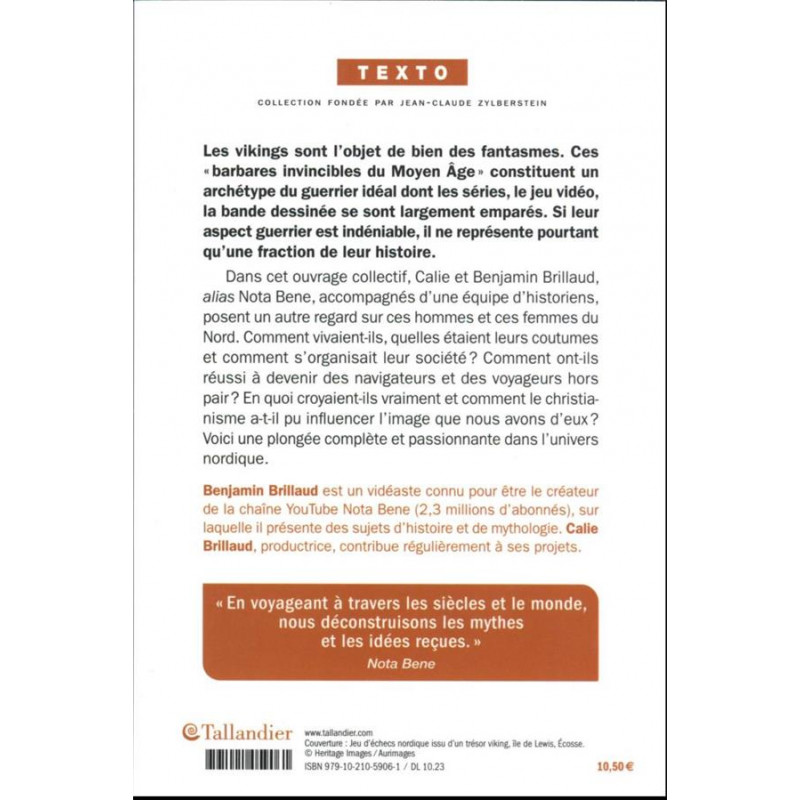 Les vikings sont l'objet de bien des fantasmes. Ces "barbares invincibles du Moyen Age" constituent un archétype du guerrier idéal dont les séries, le jeu vidéo, la bande dessinée se sont largement emparés. Si leur aspect guerrier est indéniable, il ne représente pourtant qu'une fraction de leur histoire. Dans cet ouvrage collectif, Calie et Benjamin Brillaud, alias Nota Bene, accompagnés d'une équipe d'historiens, posent un autre regard sur ces hommes et ces femmes du Nord.