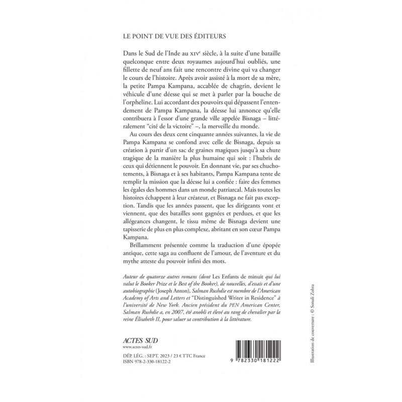 Mais toutes les histoires échappent à leur créateur, et Bisnaga ne fait pas exception. Tandis que les années passent, que les dirigeants vont et viennent, que des batailles sont gagnées et perdues, et que les allégeances changent, le tissu même de Bisnaga devient une tapisserie de plus en plus complexe, abritant en son cœur Pampa Kampana. Brillamment présentée comme la traduction d'une épopée antique, cette saga au confluent de l'amour, de l'aventure et du mythe atteste du pouvoir infini des mots.