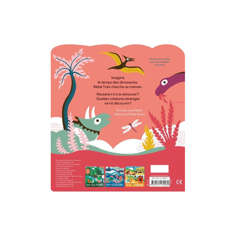 Imagine le temps des dinosaures. Bébé T-rex cherche sa maman. Réussira-t-il à la retrouver ? Quelles créatures étranges va-t-il découvrir ? Un livre tout-carton avec des matières à toucher.