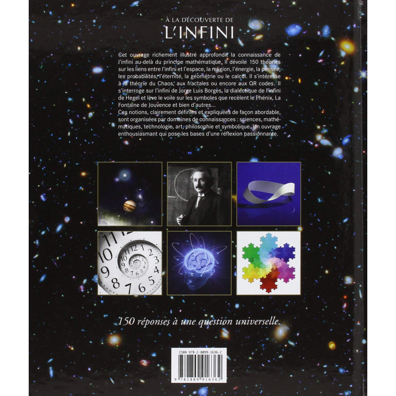 Cet ouvrage richement illustré approfondit la connaissance de l'infini au-delà du principe mathématique. Il dévoile 150 théories sur les liens entre l'infini et l'espace, la religion, l'énergie, la pensée, les probabilités, l'éternité, la géométrie ou le calcul. Il s'intéresse à la théorie du Chaos, aux fractales ou encore aux QR codes. Il s'interroge sur l'infini de Jorge Luis Borges, la dialectique de l'infini de Hegel et lève le voile sur les symboles que recèlent le Phénix, La Fontaine de Jouvence et bien d'autres...