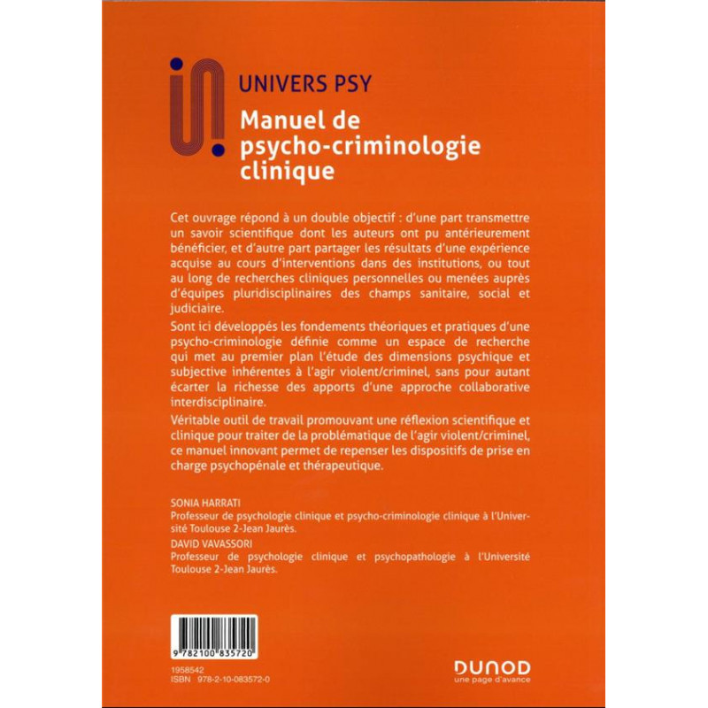 La psychocriminologie clinique s'intéresse au couple auteur/victime de violences infractionnelles qu'elles soient agies et/ou subies. Afin d'enrichir les connaissances et les pratiques professionnelles, les perspectives de prise en charge, de procéder à des évaluations, cet ouvrage propose une clinique psychocriminologique organisée, conjuguant les ressources de la clinique criminologique, de la psychologie clinique et de la psychopathologie psychanalytiques et les enseignements issus des expériences cliniques dans le champ psycho-socio-judiciaire.