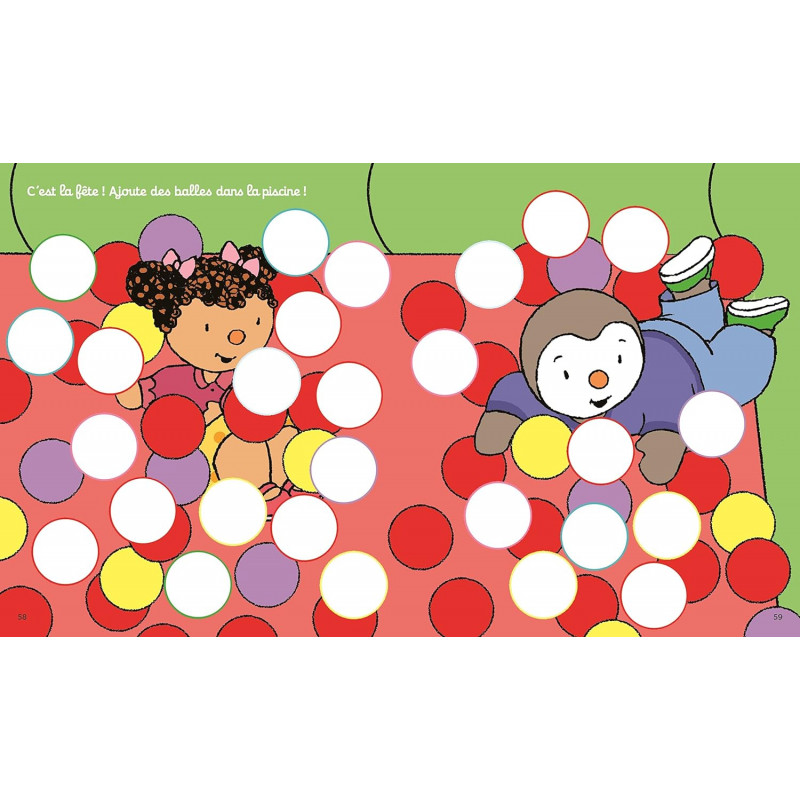 Un cahier idéal pour s'occuper, développer sa créativité et améliorer sa dextérité ! Plus de 600 gommettes et autocollants repositionnables à placer sur les grands décors ou décorer ses propres créations. des formes (ronds, carrés, triangles...) pour reconstituer un arbre, une fleur, des papillons, une piscine à bulle, une montgolfière, des animaux... Plus de 100 personnages, objets et animaux Un grand cahier de stickers pour les enfants dès 2 ans.