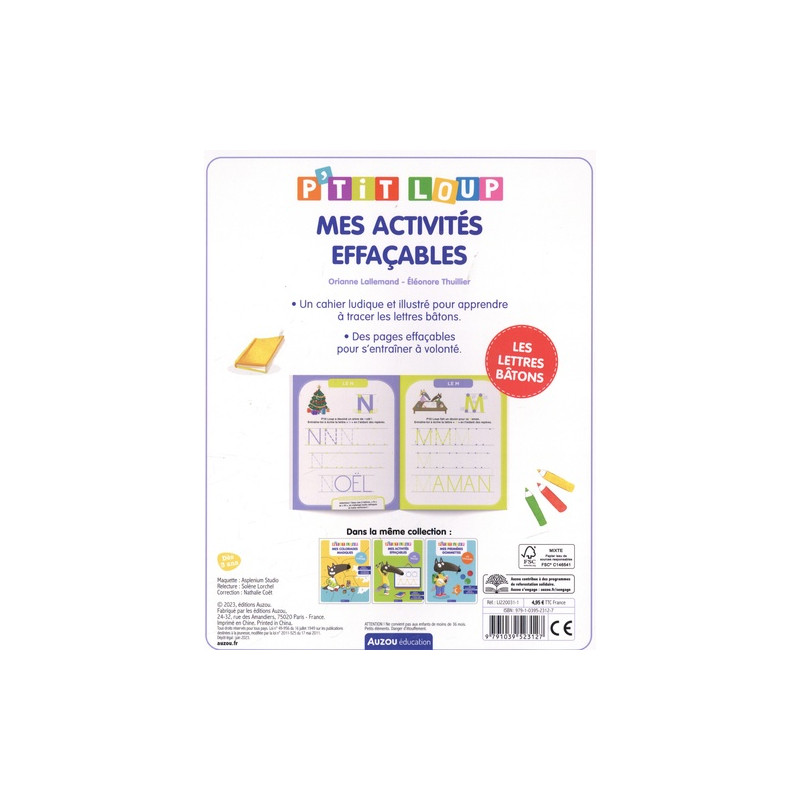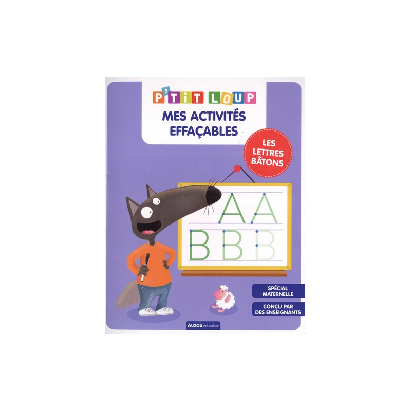 Un cahier aux pages pelliculées pour apprendre à réaliser les premières lettres bâtons. Grâce à un feutre effaçable, l'enfant réalise des exercices progressifs pour apprendre à tracer les lettres, dans l'univers de P'tit Loup. Il enrichit également son vocabulaire, grâce au dernier exercice qui propose des mots entiers.