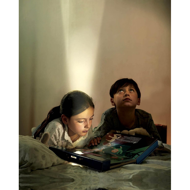 Une nouvelle édition du livre-projecteur avec une fabrication améliorée ! Ce livre tout-carton de 18 pages possède une lampe intégrée (pour lire l'histoire dans le noir complet) et un projecteur qui reproduit 9 illustrations originales de l'histoire de Peter Pan au plafond !