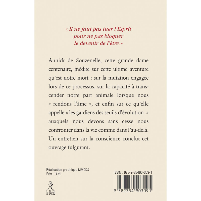 Il ne faut pas tuer l'Esprit pour ne pas bloquer le devenir de l'être. Annick de Souzenelle, cette grande dame centenaire, médite sur cette ultime aventure qu'est notre mort : sur la mutation engagée lors de ce processus, sur la capacité à transcender notre part animale lorsque nous " rendons l'âme ", et enfin sur ce qu'elle appelle " les gardiens des seuils d'évolution " auxquels nous devons sans cesse nous confronter dans la vie comme dans l'au-delà.