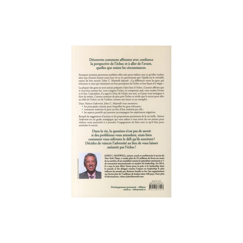Décidez de vaincre l'adversité au lieu de vous laisser anéantir par l'échec ! Pourquoi certaines personnes semblent-elles nées pour réaliser tout ce qu'elles veulent alors que d'autres luttent toute leur vie et n'y parviennent pas ? Quelle est la véritable raison de leur succès ? John C. Maxwell répond : " La différence entre les gens qui échouent et ceux qui réussissent est leur perception de l'échec et leur façon d'y réagir".