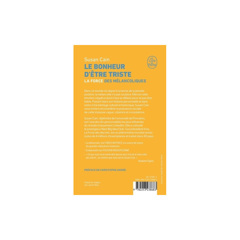 Dans ce monde où règne la tyrannie de à pensée positive, la mélancolie n'a pas sa place. Elle est cette émotion négative dont il faut se défaire pour ne pas être faible. Puisant dans son histoire personnelle et dans notre riche héritage culturel et historique, Susan Cain nous invite à reconsidérer la puissance sociale de cette tristesse vague, créatrice et consolatrice.
