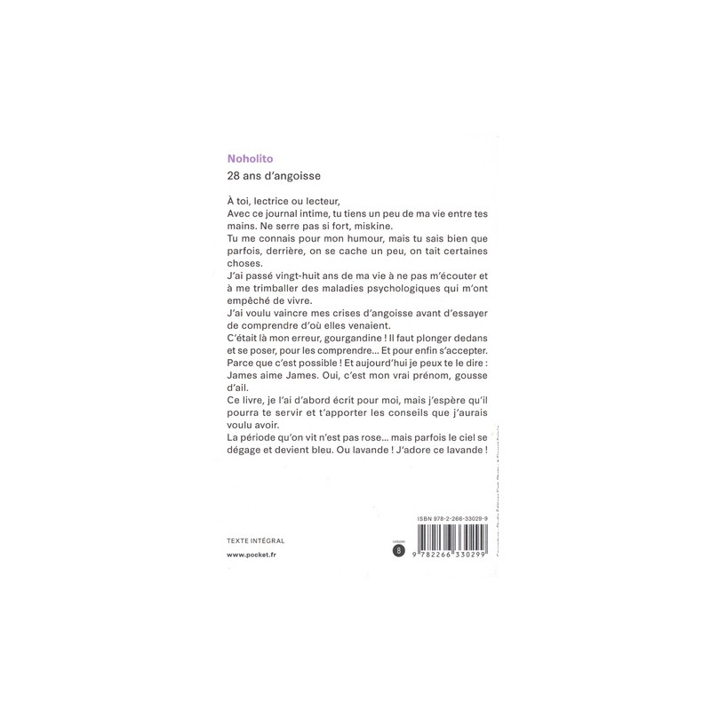 Un livre façon journal intime à la fois sensible et drôle dans lequel Noholito parle des crises d'angoisse. Noholito, sans fard ni tabou. A toi, lectrice ou lecteur, Avec ce journal intime, tu tiens un peu de ma vie entre tes mains. (Ne serre pas si fort miskine.) Tu me connais pour mon humour, mais tu sais bien que parfois, derrière, on se cache un peu, on tait certaines choses. J'ai passé 28 ans de ma vie à ne pas m'écouter et à me trimballer des maladies psychologiques qui m'ont empêché de vivre.