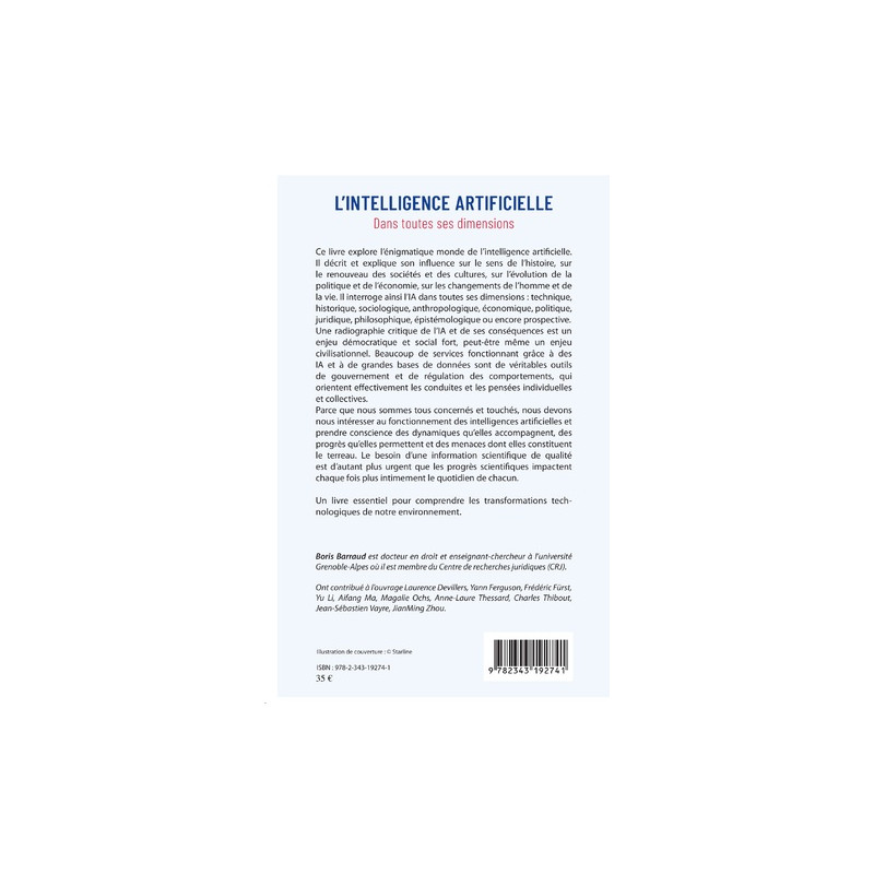 Ce livre explore l'énigmatique monde de l'intelligence artificielle. Il décrit et explique son influence sur le sens de l'histoire, sur le renouveau des sociétés et des cultures, sur l'évolution de la politique et de l'économie, sur les changements de l'homme et de la vie. Il interroge ainsi VIA dans toutes ses dimensions : technique, historique, sociologique, anthropologique, économique, politique, juridique, philosophique, épistémologique ou encore prospective.