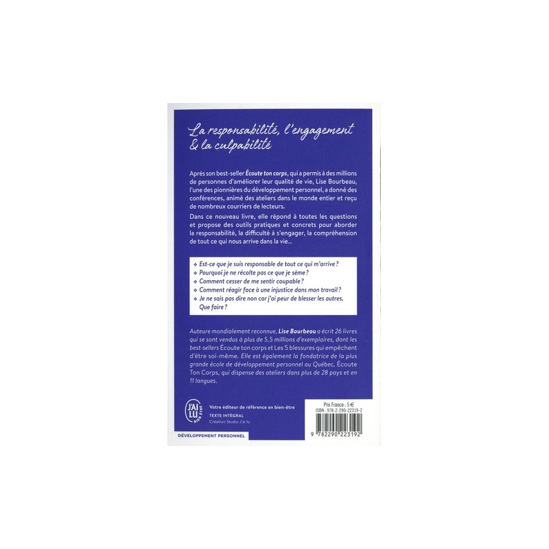 Après son best-seller Ecoute ton corps, qui a permis à des millions de personnes d'améliorer leur qualité de vie, Lise Bourbeau, l'une des pionnières du développement personnel, a donné des conférences, animé des ateliers dans le monde entier et reçu de nombreux courriers de lecteurs. Dans ce nouveau livre, elle répond à toutes les questions et propose des outils pratiques et concrets pour aborder la responsabilité, la difficulté à s'engager, la compréhension de tout ce qui nous arrive dans la vie...