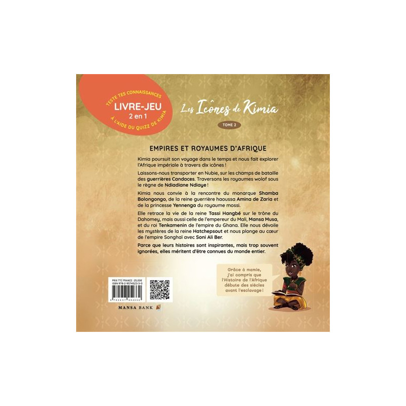 Kimia poursuit son voyage dans le temps et nous fait explorer l’Afrique impériale à travers dix icônes?! Laissons-nous transporter en Nubie, sur les champs de bataille des guerrières Candaces. Traversons les royaumes wolofs sous le règne de Ndiadiane Ndiaye?! Kimia nous convie à la rencontre du monarque Shamba Bolongongo, de la reine guerrière haoussa Amina de Zaria et de la princesse Yennenga du royaume mossi. Elle retrace la vie de la reine Tassi Hangbé sur le trône du Dahomey, mais aussi celle de l’empereur du Mali, Mansa Musa, et du roi Tenkamenin de l’empire du Ghana. Elle nous dévoile les mystères de la reine Hatchepsout et nous plonge au cœur de l’Empire Songhaï avec Soni Ali Ber. Parce que leurs histoires sont inspirantes, mais trop souvent ignorées, elles méritent d’être connues du monde entier.