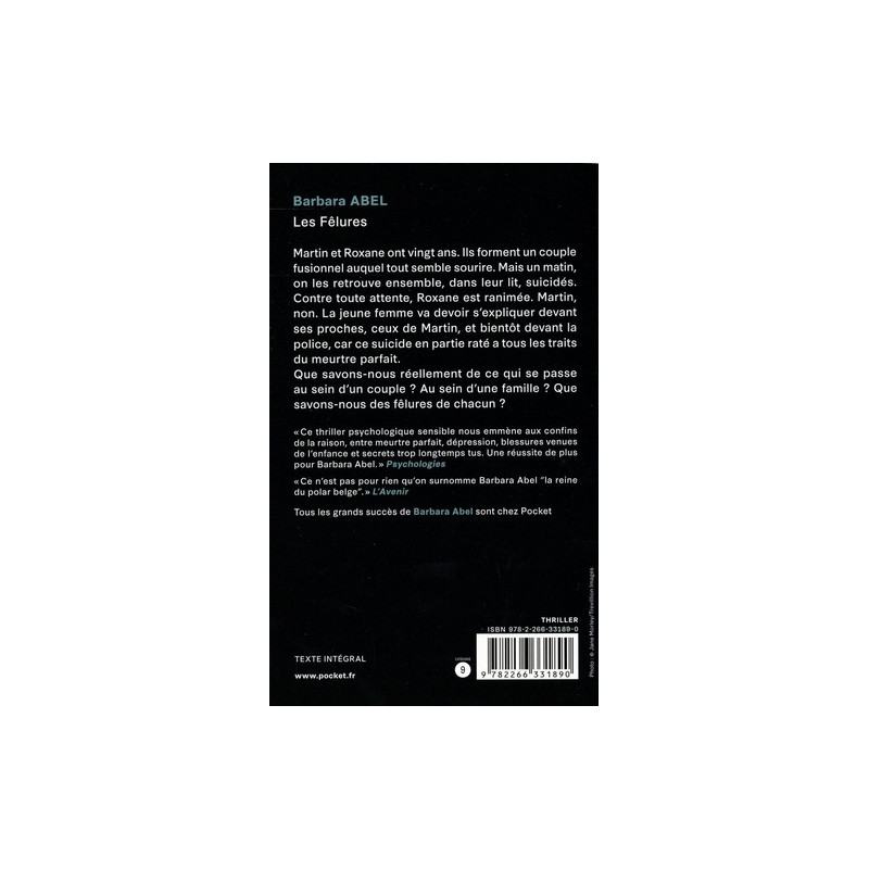 Quand les fêlures se révèlent, il est déjà trop tard ! Quand Roxane ouvre les yeux, elle sait que les choses ne se sont pas passées comme prévu. Martin et elle formaient un couple fusionnel. Et puis, un matin, on les a retrouvés dans leur lit, suicidés. Si Roxane s'est réveillée, Martin, lui, n'a pas eu sa chance... ou sa malchance. Comment expliquer la folie de leur geste ? Comment justifier la terrible décision qu'ils ont prise ? Roxane va devoir s'expliquer devant ses proches, ceux de Martin, et bientôt devant la police, car ce suicide en partie raté ne serait-il pas en réalité un meurtre parfait ? Que savons - nous réellement de ce qui se passe au sein d'un couple ? Au sein d'une famille ? Que savons - nous des fêlures de chacun ?