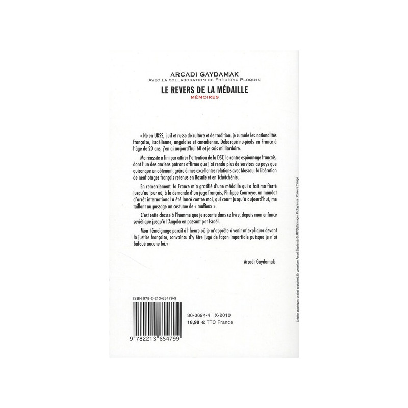 « Né en URSS, juif et russe de culture et de tradition, je cumule les nationalités française, israélienne, angolaise et canadienne. Débarqué nu-pieds en France à l’âge de 20 ans, j’en ai aujourd’hui 60 et je suis milliardaire. Ma réussite a fini par attirer l’attention de la DST, le contre-espionnage français, dont l’un des anciens patrons affirme que j’ai rendu plus de services au pays que quiconque en obtenant, grâce à mes excellentes relations avec Moscou, la libération de neuf otages français retenus en Bosnie et en Tchétchénie. En remerciement, la France m’a gratifié d’une médaille qui a fait ma fierté jusqu’au jour où, à la demande d’un juge français, Philippe Courroye, un mandat d’arrêt international a été lancé contre moi, qui court jusqu’à aujourd’hui, me taillant au passage un costume de « mafieux ».C’est cette chasse à l’homme que je raconte dans ce livre, depuis mon enfance soviétique jusqu’à l’Angola en passant par Israël. Mon témoignage paraît à l’heure où je m’apprête à venir m’expliquer devant la justice française, convaincu d’y être jugé de façon impartiale puisque je n’ai bafoué aucune loi.»Arcadi Gaydamak