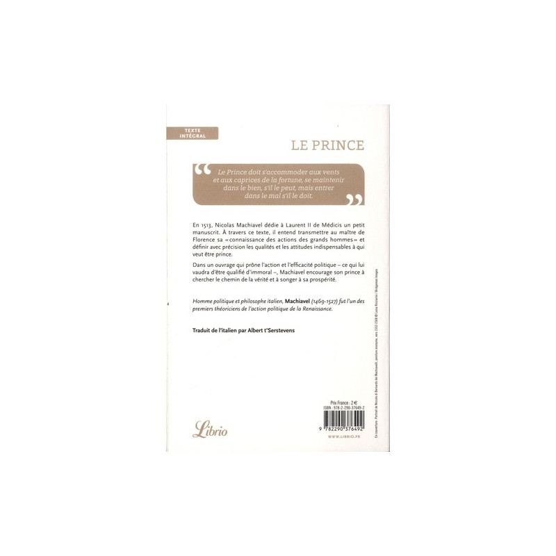"Le Prince doit s'accommoder aux vents et aux caprices de la fortune, se maintenir dans le bien, s'il le peut, mais entrer dans le mal s'il le doit." En 1513, Nicolas Machiavel dédie à Laurent II de Médicis un petit manuscrit. A travers ce texte, il entend transmettre au maître de Florence sa "connaissance des actions des grands hommes" et définir avec précision les qualités et les attitudes indispensables à qui veut être prince.