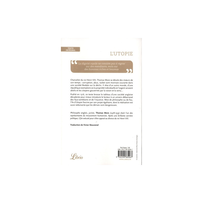 Chancelier du roi Henri VIII, Thomas More se désole des moeurs de son temps : corruption, abus, racket sont monnaie courante dans une société féodale sur le déclin. Il rêve d'un autre monde, d'une république exemplaire, où la propriété individuelle et l'argent seraient abolis et les citoyens gouvernés par la raison et la vertu... Publié en 1516, ce texte brosse le tableau d'une société anglaise décadente pour mieux introduire le lecteur à un univers débarrassé des faux-semblants et de l'injustice.