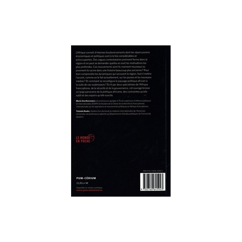 L'Afrique connaît d'intenses bouleversements dont les répercussions économiques et politiques sont à la fois considérables et préoccupantes. Des vagues contestataires prennent forme dans la région et on peut se demander quelles en sont les motivations les plus profondes. Ces mouvements sont-ils vraiment nouveaux ou prennent-ils racine dans une histoire beaucoup plus ancienne ? Pour bien comprendre les dynamiques qui secouent la région, faut-il mettre l'accent, comme on le fait actuellement, sur les jeunes et les nouveaux médias ? Et comment se reconfigure le paysage politique africain à la suite de ces soubresauts ? Ecrit par deux spécialistes de l'Afrique francophone, de la sécurité et de la gouvernance, cet ouvrage brosse un large panorama de la politique africaine, des contraintes qu'elle subit et des espoirs qu'elle suscite.